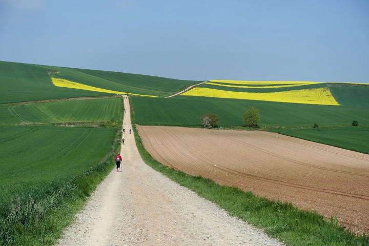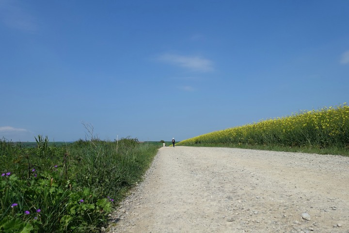 最初は赤土のぶどう畑の中を歩き、Azofraを過ぎる辺りから緑の麦畑、時おり菜の花畑の黄色が織りなす一本道を歩きます。こんな道が有るのだろうか?これがカミーノ!とその美しさに感激しながら歩きました。