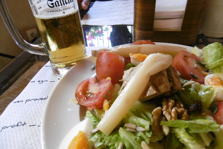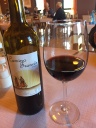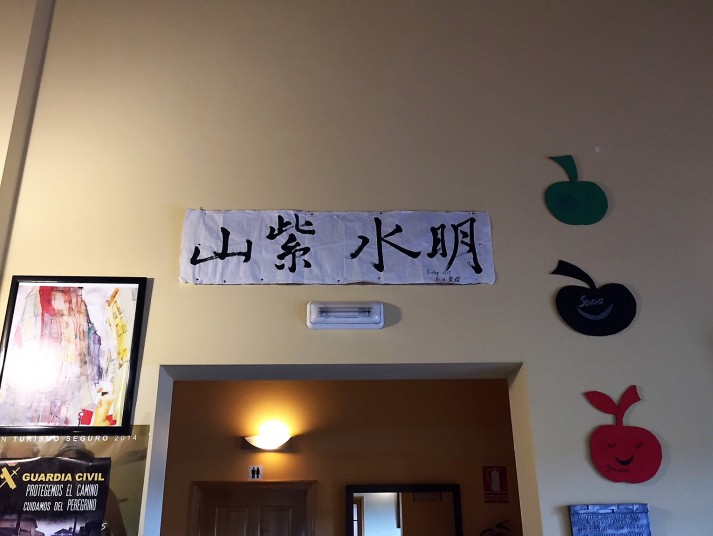 今日のアルベルゲは村の外れ、天気も回復して強い日差しになり、洗濯物の乾きが早い。2時間もすれば靴下以外は乾いてしまう。夕食もここで、ワインは「Camino Frances フランス人の道」。食堂には昨年泊まった日本人が書いた「山紫水明」の書が飾ってあります。 |