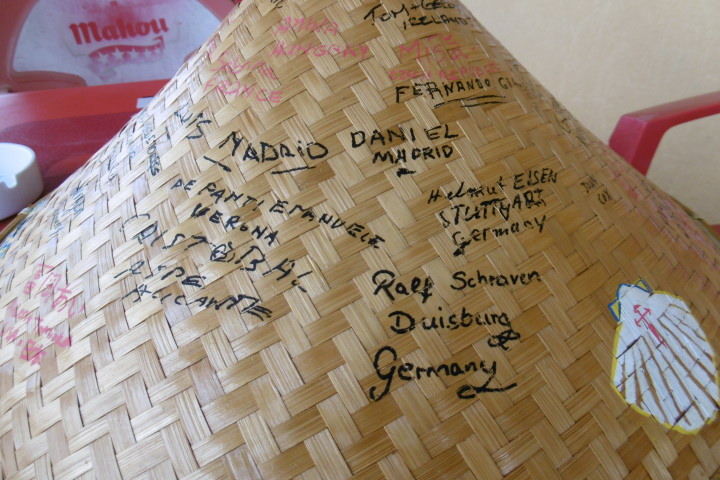 旅のトラブルその2。菅笠が一部壊れました。この菅笠は奥の細道で使ったものを補強して持ってきたもの。以前も壊れた箇所が連日の強風で再度やられてしまったらしい。巡礼者からサインを貰っているので何とか日本に持って帰りたい。幸い、今日も同行した山崎さん(別名Mr.Gomitory)に応急修理をしていただきました。