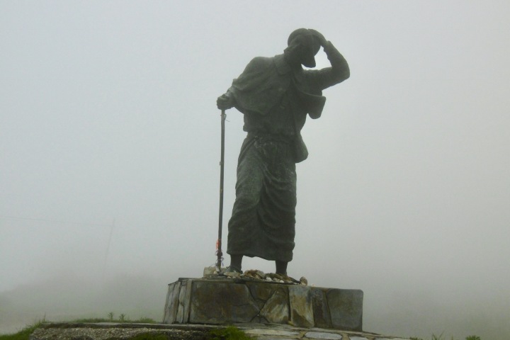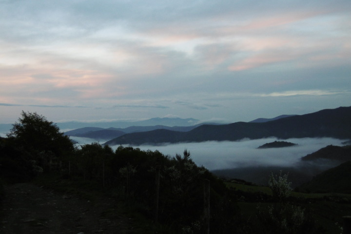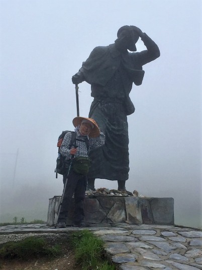 雲海が見えたり、山の雄大な景色を拝めたりと良い事もありました。 最初の村La Laguna ラ・ラグナの近くになると大きな犬が出てきて前を進みます。何となくこの犬に導かれるように進んで行くとバルがありました。ここで朝食、あの犬はここの飼い犬のようでした。 オ・セブレイロにあるサンタ・マリア・ラ・レアル教会は9世紀に建てられた巡礼路で最古の教会、中はキリスト像があるだけの極めてシンプルな教会です。近くにケルト時代から続く茅葺きの円形住居跡Pallosa パジョッサもありました。 昨日から喉の調子がイマイチな事もあり、今日は無理をせず、当初予定の場所より7km手前の村に泊まることにしました。宿に着くなり雨が降ってきて、いいタイミングでした。 今日のハイライトはロシアから来たナターシャ。荷物をゴロゴロ転がしながら厳しいアップダウンを歩いています。普通はこういう荷物はトランスポートして軽装で歩きますが、彼女はこの形でサン・ジャンを4月23日に出発してここ迄来たとの事。大国ロシアの人のやる事は常識では測り知れません。スタイルも「ちょっとそこまで散歩に」という風。でも、ソニーのデカイ一眼レフを持ってました。 |