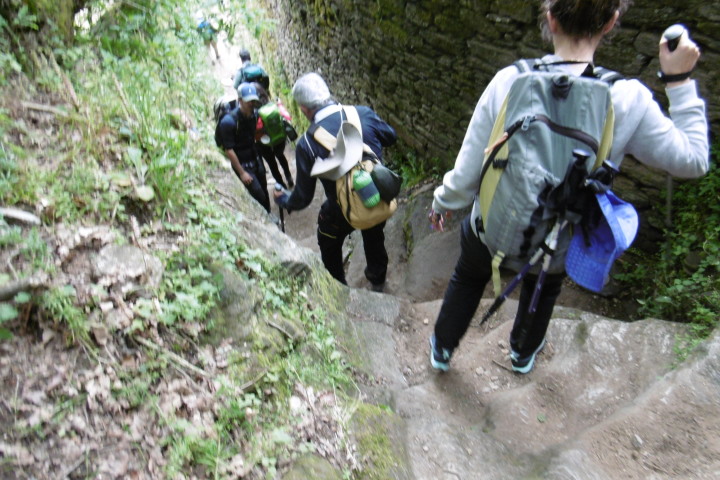 いよいよ巡礼も佳境に入り今日はサンティアゴまで残り100kmの標識を越えます。朝から曇りの天気、サリアは大きな町で、フランス人の道を歩く人の44%はここサリアを出発点とするようで、アルベルゲを始め多くの宿泊施設が揃っています。また、立派な教会も目につきます。 サリアを抜けるとジワジワと上りになり、ピークは660mのAlto Paramoで標高差260m、その後は350mのPortomarinまで一気に下ります。最後は最も急な坂が待っていました。安全な迂回ルートを選んだつもりが急坂の正規ルートへ行ってしまったようです。残り100kmの標識は落書きが多く汚れています。これは残念なこと。 今日の目的地ポルトマリンは、元はミーニョ川を堰き止めたダム湖に沈んだ町。それを今の新しい形の町にしたといいます。Iglesia de San Juan サン・ファン教会は12世紀のロマネスク建築ですが、ダム湖に沈む前に石を一つ一つばらして運び上げて復元したもの。石にそのNoが振られていました。 予定のアルベルゲに行くとどうも予約が上手く通っていなかったらしく満室でダメ。ホームページから予約メールを送ったが行き違いがあったらしい。でも、近くのアルベルゲを紹介してもらって事なきを得ました。また、今日は日本人では珍しい夫婦の巡礼の方にお会いしました。 |