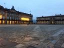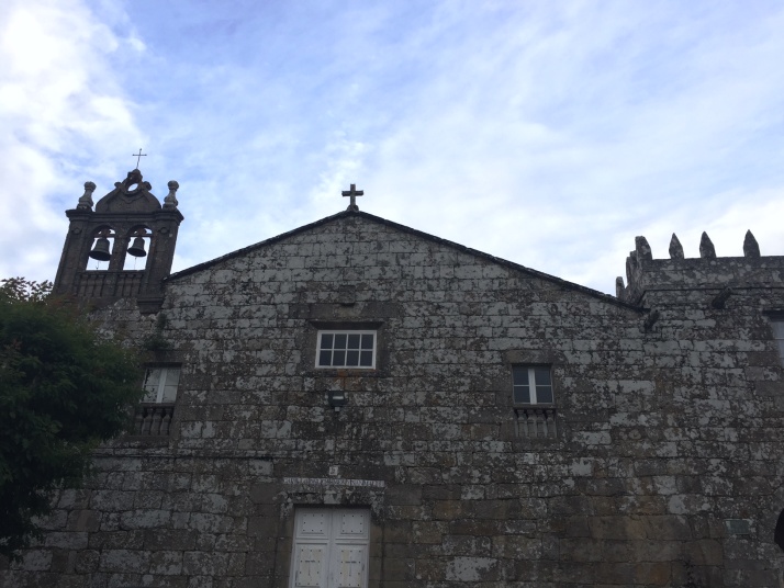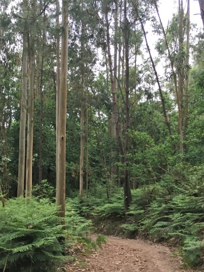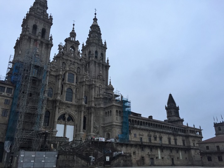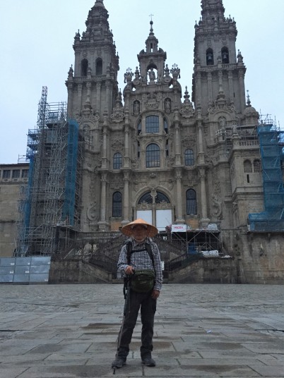 フィニステレへ90kmの第1日目はネグレイラまで。今日の距離は短くてガイドでは22.4kmでしたが、実績は20.7kmで12時30分には到着しました。 6時半にアルベルゲを出発。先ずは大聖堂へ、早朝のオブラドイロ広場は静かです。僅かに女性二人が到着の感激に浸っていました。この女性たち、途中で私の菅笠姿の写真を撮ったと見せてくれました。思わぬ出会いです。お互いに写真を撮って別れました。 サンティアゴ迄の様子と違い、歩く巡礼者は疎らです。ここを歩く人は巡礼者の5%程と言います。殆どはサンティアゴで終了とし、仮にフィニステレに行くとしてもバス利用が大半で歩く人は少ない。又、トランスポートを利用する人も無く、皆重い荷物を背負って歩いています。