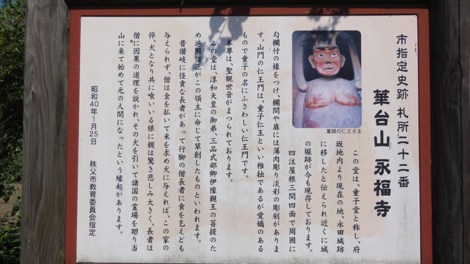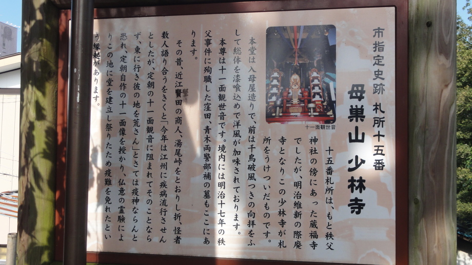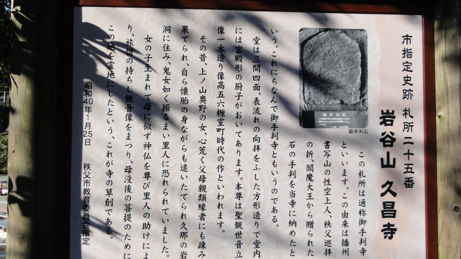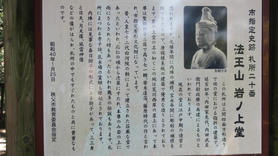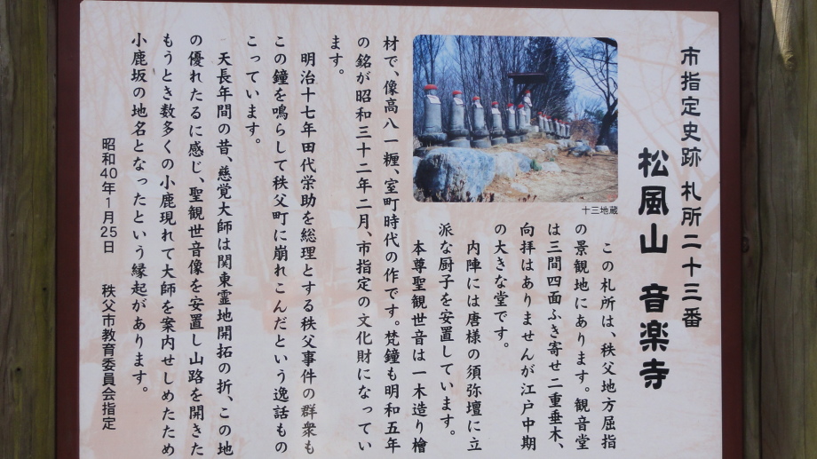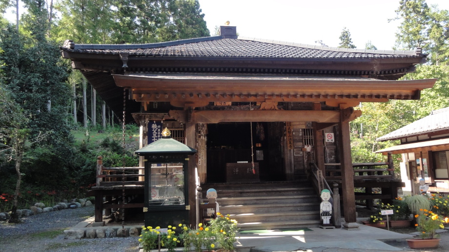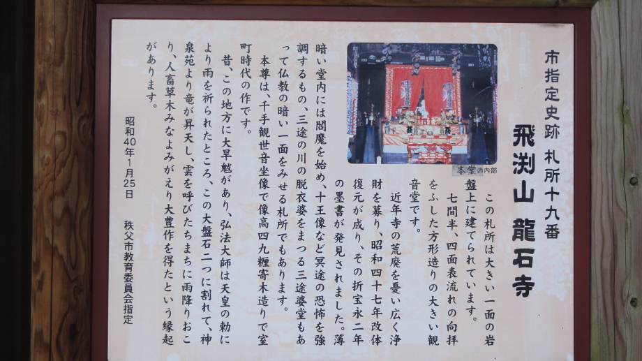 2日目は、前半は秩父市街の中心を回り、札所20番からの江戸巡礼古道は昔ながらの道を歩くことが出来ました。 18番神門寺(ごうどじ)を経て、本堂が巨大な岩盤上に建てられている19番龍石寺(りゅうせきじ)に10時35分に到着。荒川を渡って20番岩之上堂(いわのうえどう)へ。更に藁葺の仁王門(ここの仁王像の顔が童子のよう)がある22番童子堂(どうじどう)を経て急な坂道を登って23番音楽寺(おんがくじ)へ。近くの蕎麦屋で昼食をとり、また、山道を歩いて24番法泉寺(ほうせんじ)に。更に進むと「秩父錦 酒造りの森」があります。酒蔵資料館と観光物産館があり、試飲コーナーもあったので遠慮なく頂きまました。 ちょっとほろ酔い気分で歩いていると、道路に牛が! 牧場から牛舎の戻る途中で止まっている様子、動く気配もないので暫く睨み合い。牛が去るのを待って出発です。15時過ぎに25番久昌寺(きゅうしょうじ)に到着、再び荒川を渡って秩父鉄道を横切り、26番円融寺(えんゆうじ)へ。更に1.5q離れた奥の院岩井堂へ行きます。岩井堂は昭和電工の工場内にあり、受付に行くと弁えたもので直ぐにパンフレットをくれて道案内をしてくれました。暫く進むと直段204段の石段、更に自然石の石段を登るとやっと懸崖造りのお堂に着きました。 本日は此処までとし、影森駅から御花畑まで秩父鉄道で戻って、西武秩父の仲見世で前回寄った店に入り一杯やって帰宅しました。 |