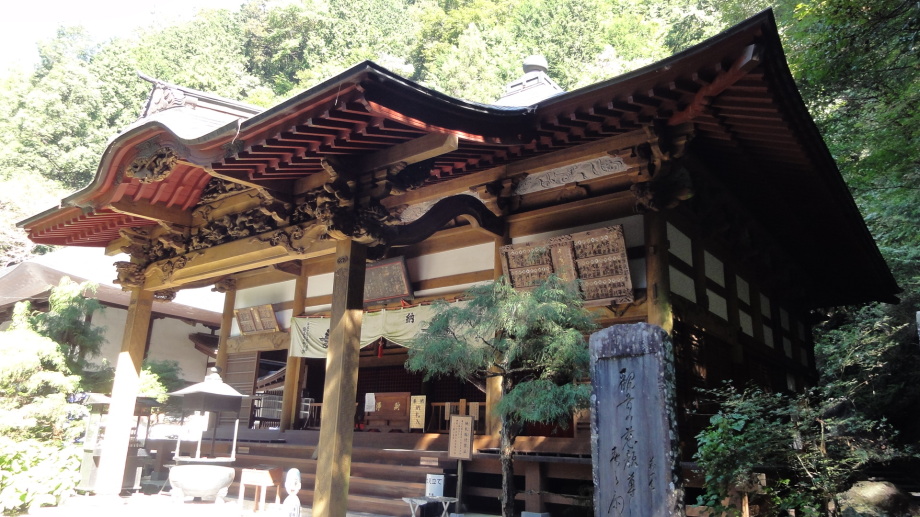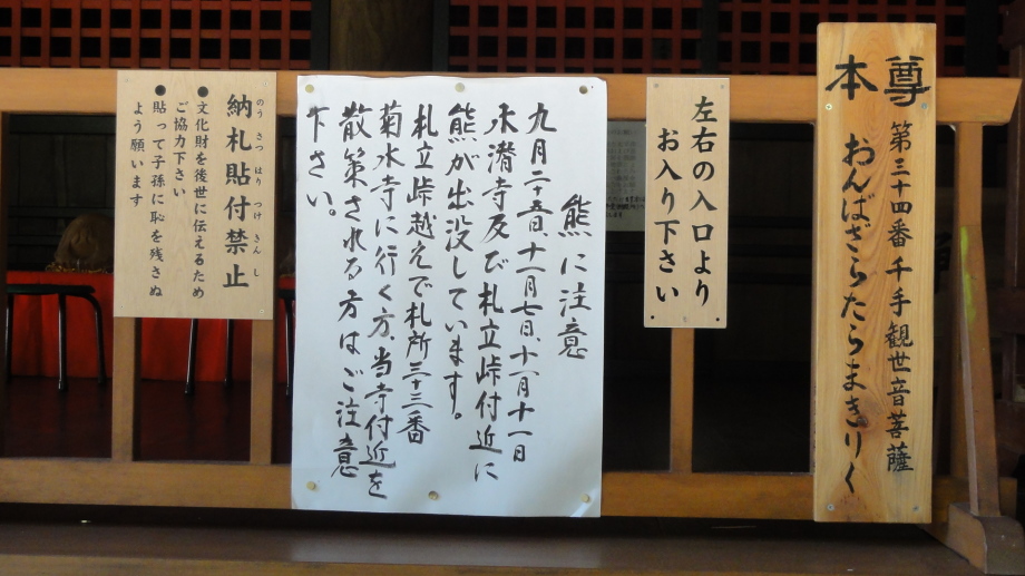 5日目は最後に残った札所34番を回るのみです。 龍勢会館に行くと火曜日で本日休館。今日は10q足らずの行程なので少し寄り道と思い、先ず、椋神社へ。境内では観客席を作る作業の真っ最中。少し離れた所では関係者以外立ち入り禁止でロケット作りをしていました。工事関係の人が、今日はロケット発射台まで行けるというので、近くまで行って写真に収めました。神社の人の話だと、今年はフジテレビで放送されたアニメ「あの花」の影響もあり雰囲気が違うとのこと。 11時に椋神社を出発して33番水潜寺(すいせんじ)に向かいます。1時間程舗装された坂道を登ると、例によって「熊注意」看板がある山道へ。ここから約1時間で札立峠(標高517m)を経て水潜寺に到着しました。なかなか厳しい山道でした。本堂の前には「(昨年と思われるが)9月25日、11月7日、11月11日に水潜寺、札立峠に熊が出没、注意を」との張り紙がありました。特にこれから冬眠前までは注意が必要ですね。 帰りは、バスで秩父鉄道皆野駅に出て御花畑へ。西武秩父の仲見世の蕎麦屋でゆっくりして帰宅しました。 |