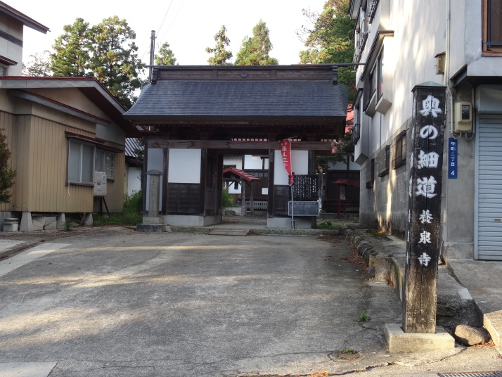 国道47号線(北羽前街道)を進み、途中から左折して県道28号線に入るとあとは尾花沢まで道なりです。10時半に山刀伐峠の入口に到着、登り口が分からず少しウロウロした後、登り始めました。ブナ林の美しい、結構急な坂が続きます。11時に山頂に到着、俳人・加藤楸邨の筆による「奥の細道」顕彰碑と子持ち地蔵、子持ち杉がありました。ここから下り、28号線に合流して暫くすると関谷の集落に「関谷番所跡」の標柱がありました。 順調に歩を進め、3時半に尾花沢に到着です。芭蕉は旧友の鈴木清風を訪ねて尾花沢に10泊しています。私が週一回通っているオープンカレッジの受講生達が4年前に尾花沢を研修旅行した時にお世話になった諏訪神社の宮司さんと芭蕉清風歴史資料館で待ち合せしました。更に鈴木家15代ご当主にもお会い出来、一緒に清風の財で建立した念通寺や芭蕉が7泊した養泉寺、諏訪神社を回りながら貴重な話を伺うことが出来ました。 |