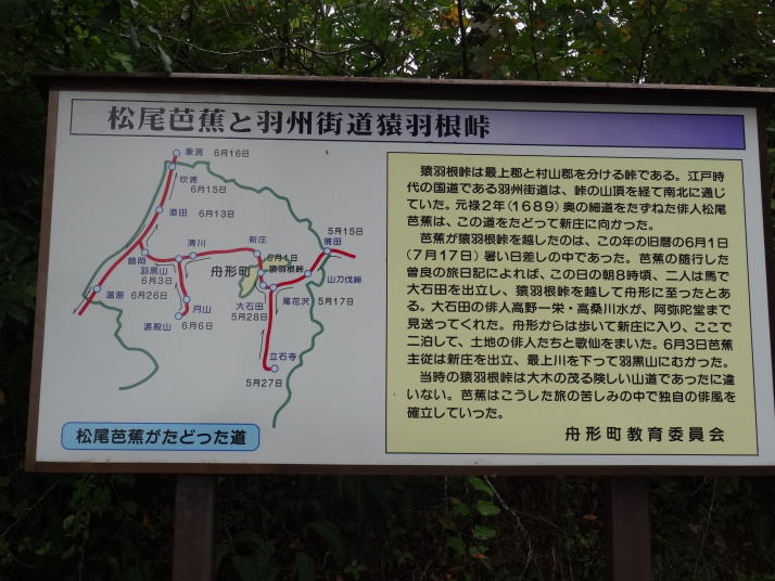 | 昨日の終点芦沢まで電車で戻って出発です。名木沢宿を過ぎると猿羽根(さばね)峠への道に入ります。暫く山道を進むと、日本三大地蔵の一つ猿羽根山地蔵尊に着きました。芭蕉句碑『月の香も南に近し最上川』があります。これはおくのほそ道には載っていませんが、芭蕉が新庄の風流・盛信に招かれた時に猿羽根峠の眼下を流れる最上川に着想を得て詠んだ発句で「曽良俳諧書留」に入っています。又、猿羽根峠と芭蕉の関係の説明板もあり、偶々お堂の補修工事をしていた作業員の人達と暫し奥の細道談義をしました。