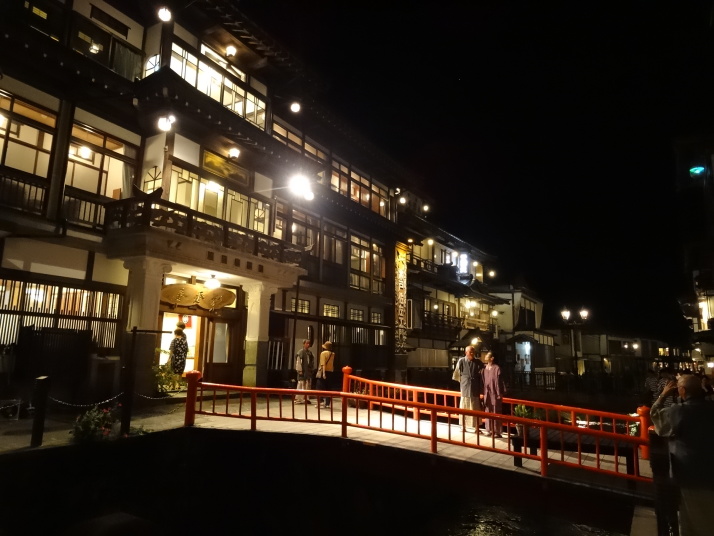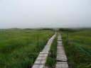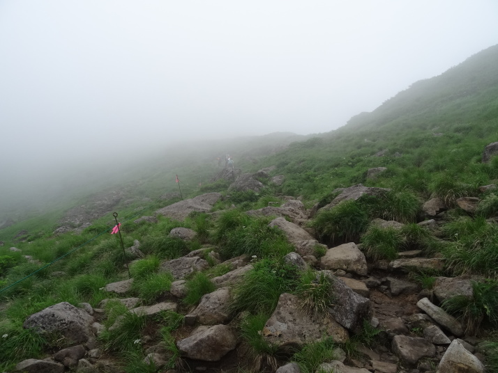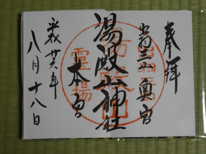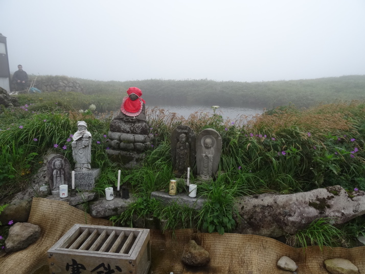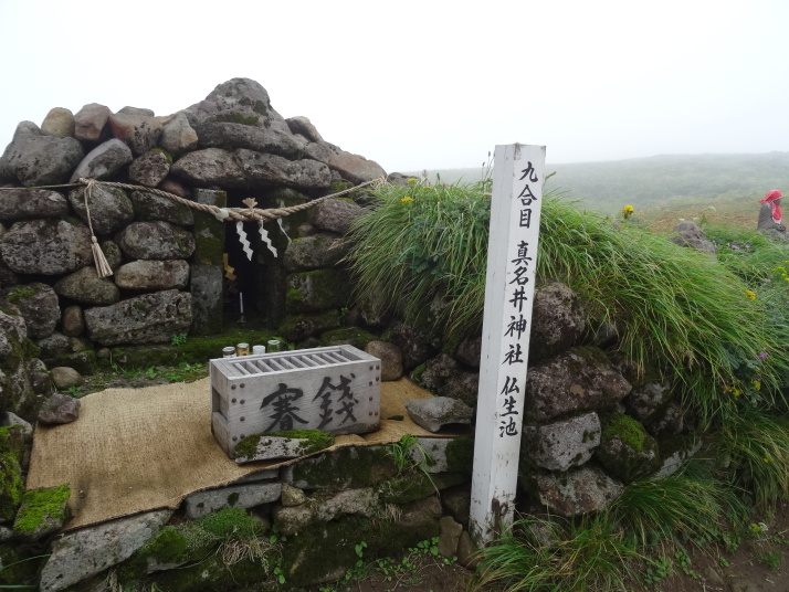 8時に休暇村を車で出発、8時40分月山七合目(合清水)から歩き始めました。曽良日記によると芭蕉も七合目(旧高清水)まで馬を利用しているのでそれに倣いました。30分ほどで八合目の弥陀ヶ原に到着、ここから岩がごろごろする登山道を登り、10時半に九合目の仏生池を通過、11時45分に山頂に着きました。九合目を過ぎると濃いガスが発生したり、強風や雨が降ったりと天候の変化の中を歩き難い道を進むことになりました。 山頂で月山神社を参拝、登拝認定証とご朱印をもらいました。出羽三山のご朱印は全て両開きの大型のご朱印で、伊勢神宮と同じ様に神社間で統一性があります。登頂後は今日の宿、銀山温泉に向かいました。 |