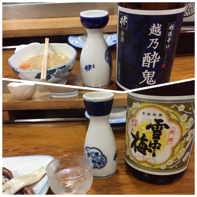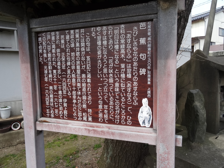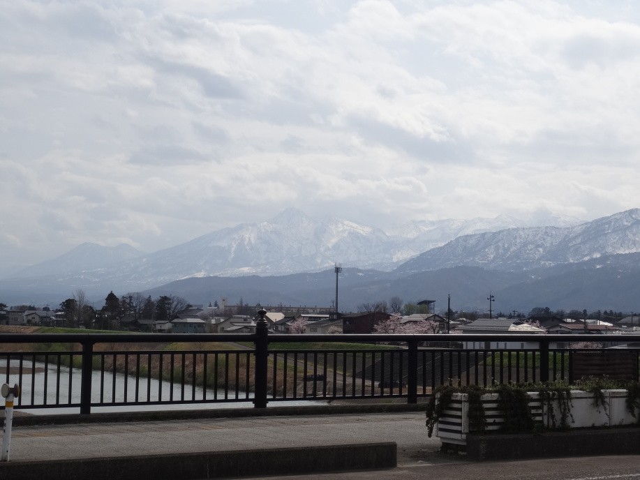 海に近い道を暫く進むと人魚姫伝説公園があります。小川未明作「赤いローソクと人魚」は雁子浜の人魚塚の伝説をヒントに書かれたそうですが、その人魚は佐渡出身です。この辺りから綺麗な北陸の山々を見ながらの歩きになります。酒蔵2軒を巡って犀潟駅で休憩、構内には片岡鶴太郎が書いた駅名看板が掛けられています。黒井宿の本敬寺の境内に芭蕉句碑「さびしさや花のあたりのあすならふ」があります。奥の細道紀行300年記念事業で建てられた由(でも、この句は奥の細道とは関係ない)。 信越化学や新日鉄住金の工場を過ぎ、関川に沿って南下、中央橋を渡る辺りから急に人出が増えてきます。高田公園では「高田城百万人観桜会」が開催されています。4000本と云われる桜は満開でした。更に酒蔵巡りを挟んで芭蕉が高田で泊まった池田六左衛門宅跡へ。儀明川にかかる高田橋の袂にあるといい、現在はTakada556ビルになっていました。 ホテル到着後は隣の「市民いこいの家」の大浴場でさっぱりしてから夕食へ。日曜なので休みの店が結構ある中、居酒屋平次で新潟の酒を友に声の大きな大将と話しながらひと時を過ごします。明日行く予定の芭蕉が今町(直江津)で泊まった古川市左衛門宅跡の場所(旧マルセンデパート)を訊き出しました。 |