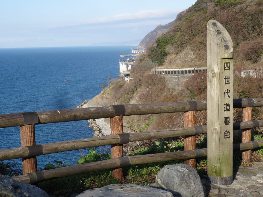 好天に恵まれ気持良くスタート。糸魚川の中宿で自転車歩行者道が終わると市街地へ。芭蕉が躓いてびしょ濡れになった早川を越えて暫く行くと「雪鶴」の田原酒造、少し先には相馬御風の生家があります。こちらは見学に事前予約が必要とのことで残念ながら素通り。 親不知駅からは宿の車で送迎してもらいました。この途中、奥の細道を歩いていること、明日も危険回避で親不知駅から市振駅まで電車を使うなど話していると、市振まで国道8号線の下に地元の人しか知らない道があると教えてくれました。その道へ降りる場所とか難所のポイントなど案内してくれながらホテルに到着。まだ時間があるのでホテル脇から親不知コミュニティロードを散策、「如砥如矢(とのごとしやのごとし)」絶壁を切り開いて明治16年に完成した旧北陸道の喜びを刻んだ跡がありました。また、最近整備されて通れるようになった旧北陸本線の親不知トンネル670mを歩きました。 |