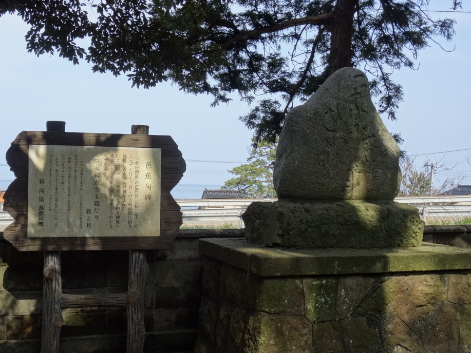 親不知から市振までは昨日ホテルの主人から聞いた道を行きます。親不知コミュニティロードを進み、国道8号線の天険トンネルの出口と合流した後30〜40m進むと洞門手前に下に降りる急階段があります。草木に覆われていますが今の時期は枯れていて何とか歩くことが出来ます。この急坂を80mほど下るとコンクリートの道?に出ます。右に日本海が広がる絶景、この道が市振まで続いています。途中、道が切れている箇所が数か所ありますが何とかクリア、気持良い約4qのウオーキングを楽しみました。 市振の「海道の松」近くの海岸でヒスイを拾っている人に出会いました。この辺りはヒスイ海岸とも呼ばれ宝石質のヒスイが取れるのはこの地域だけらしい。ヒスイは緑色のイメージですが白っぽかったな。芭蕉が泊まった桔梗屋跡、相馬御風書の芭蕉句碑「一家に遊女も寝たり萩と月」がある長円寺、高田藩が開設した市振関所跡を見て更に進むと「黒部峡」で人気の林酒造場があります。その先に境関跡、加賀藩が開設した日本最大級の関所です。境川を挟んだ市振関所・境関所で越後から越中へ入りますが、芭蕉は「おくのほそ道」の越後路の段で「鼠の関を越ゆれば、越後の地歩行を改めて、越中の国市振の関に到る。」と書いています。でも市振はまだ越後の国、ひょっとすると既に越中に入ったと思い込み、「おくのほそ道」で最も色っぽい「一家・・」の句を詠んだのでしょうか。 あいの風とやま鉄道線を渡った辺りに「わせの香や分入右ハありそ海」の句碑が建っています。説明文を読むと200年前に建てられたものらしい。その後はひたすら距離を稼ぐ歩き、天気が良く立山連峰を望みながら気持良い。黒部川の袂に可愛い芭蕉像の「奥の細道記念碑」が建っています。平成9年7月に第10回「奥の細道」入善サミットの開催を記念して建立とありました。 |