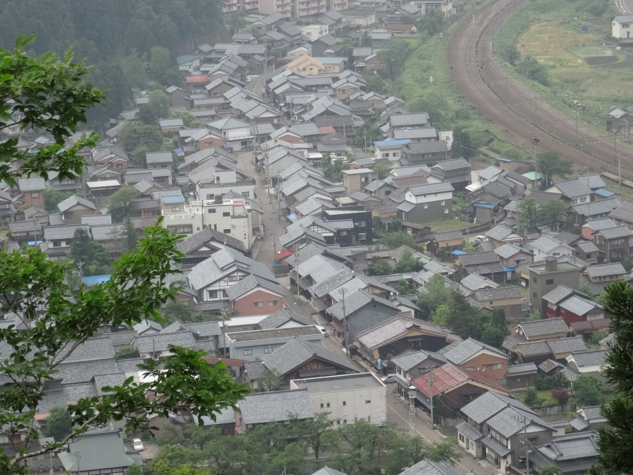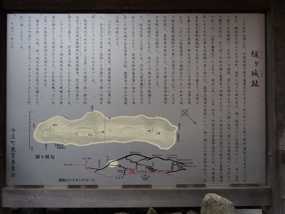 コンビニで昼のおにぎりを買ってスタート、先ず、燧ケ城址(270m)を登ります。「源平盛衰記」や「太平記」に度々登場、戦国時代にも一向一揆の拠点になるなど数世紀にわたり戦略上の重要な拠点として利用された城。結構急な道を登って頂上に着くと今庄宿が一望出来ます。下って今庄宿の南の外れには「文政の道しるべ」。北陸道(京・敦賀・若狭)と北國街道(京・伊勢・江戸)の追分の道しるべ。石柱には「右京 つるが・わかさ道」「左京 いせ・江戸道」と刻まれています。