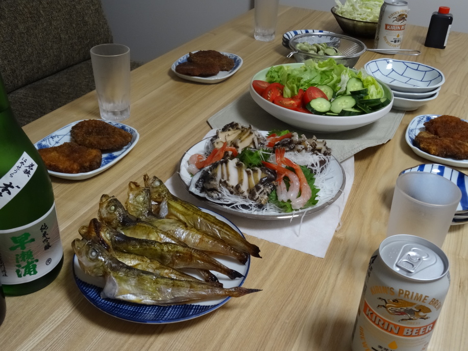 今日からお世話になる宿は、敦賀の廻船問屋?田保玄流宅。下斗米等栽も同宿しました。初日は家で男料理。鮑・えびの刺身、ハタハタの焼き、敦賀のソースカツ、おこぜの汁物、そら豆、サラダなど豪快に頂きました。