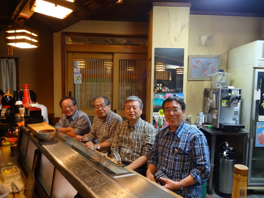松阪から一駅戻って六軒からスタート。市場庄町や久米町は古い町並みそのままで、良く残してくれていると感謝の気持ちで歩いていました。舟木家の長屋門は立派で南北朝時代から続く当家の格式を示しています。松阪に着くと三井家発祥地にライオン像がいます。これは平成27年に三越から松阪市に寄贈されたもの。 本居宣長旧居跡から松阪城址のある松阪公園へ。城跡を歩いた後は本居宣長記念館、本居宣長生家(鈴屋)を見学、本居宣長ノ宮を詣でて先に進みます。櫛田橋の手前の民家の門柱が櫛田橋で使われていたらしい石柱でした。どういう経緯か分かりませんがちょっとビックリ。櫛田川を渡って暫く行くと「斎王まつり」の幟が目につきます。この辺りは昔、斎宮があった場所で、今でも発掘調査が続けられています。斎宮歴史博物館を見学した後、発掘調査の現場、史跡斎宮跡を10分の1に縮小した模型のある斎宮跡歴史ロマン広場、斎宮の正殿、東西脇殿を復元した「さいくう平安の杜」を経て宮川駅から松阪に戻りました。尚、斎王まつりは6月4日、5日。ボランティアの方に誘われたが予定があるので丁重にお断り。 松阪に戻ると嬉しい出会いが。最終日の伊勢参りを一緒に歩こうと、新井曾良、山口露通、石井越人が集まってくれました。曾良は2日目に春日部から歩いて以来、露通・越人も一昨年、出羽三山を一緒に登った仲、有難いことです。先ずは松阪牛の焼肉を「千力」で、美味かった。2次会は「竹の子」で日本酒。楽しい前夜祭でした。 |