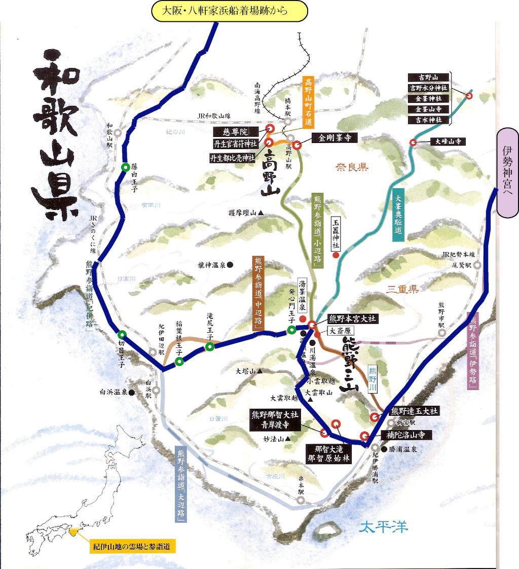 @ 大阪から紀伊半島西岸を「紀伊路」で進み、田辺から山中を進む「中辺路(なかへち)」。