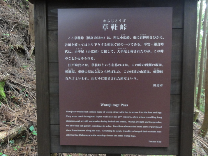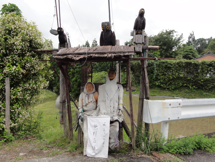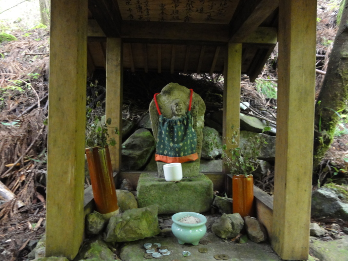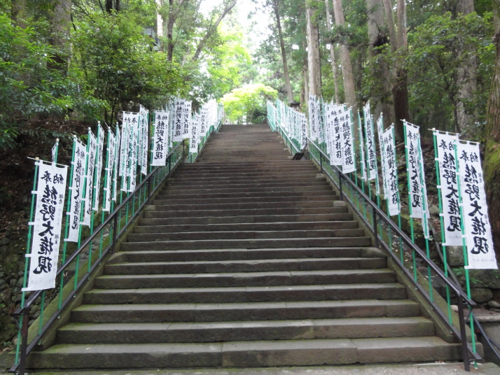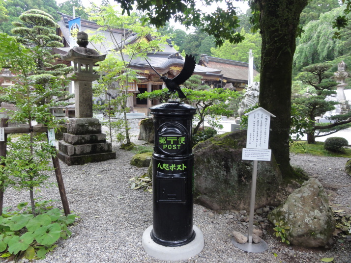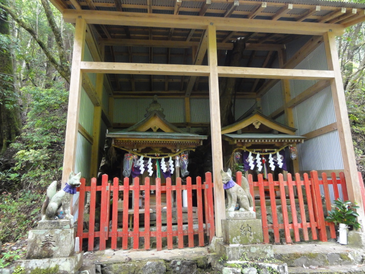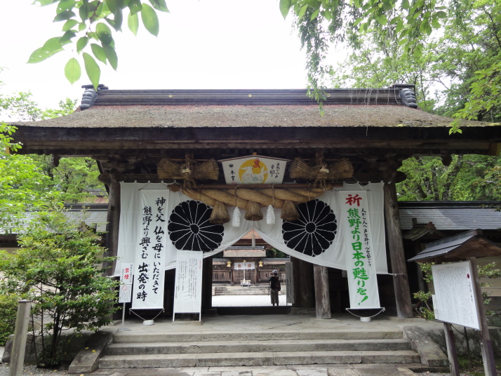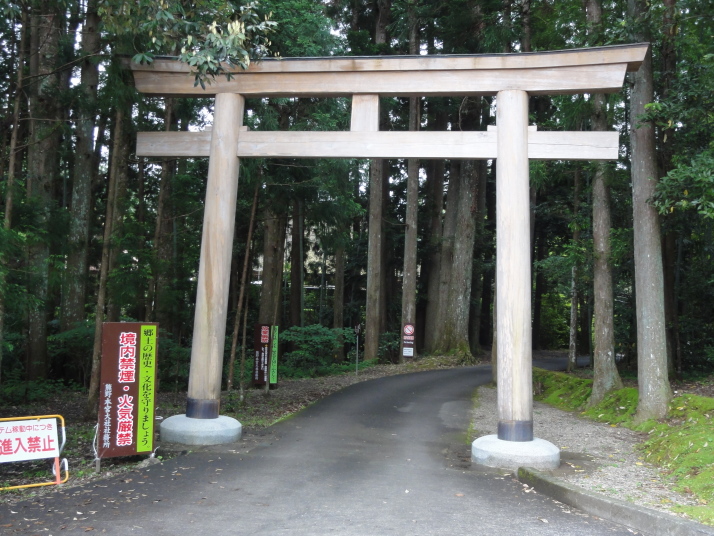 6時半に宿を出発、小広峠まで車で送ってもらいました。雨が降っていて雨具の用意をして7時にスタート、直ぐに熊瀬川王子です。その後は急な登りを進んで7時20分に草鞋峠(592m)に着きました。この先は女坂の下り坂になり、仲人茶屋跡(470m)を過ぎると男坂の急な登りになり、登りきったところに岩神王子(655m)があります。ここからは急な下りに変わります。途中、王子製紙社有地の立札が幾つか立っていました。おぎん地蔵、一里塚を経て9時15分に湯川王子(400m)に到着。この辺りは湯川一族発祥の地でもあります。ここから登りに変わり、登りきった所が三越峠(550m)で三越峠関所跡がありました。付近には綺麗なトイレ・休憩所があり、暫し休憩です。 三越峠からは急な下りになり、11時前に船玉神社(230m)に到着、更に進んで猪鼻王子にに着きました。これからは登り下りを繰り返しながら高度を下げて本宮大社(89m)に向かうことになります。11時20分に発心門王子に到着。発心門とは、悟りの心を開く入口(門)という意味でここからが熊野本宮大社の神域とされています。旅館の主に言われたように、手前の鳥居の前で2拝・2拍手・4拝×2して本宮大社に入るお願いをしました。その先の発心門休憩所で昼食。今日は旅館で作ってくれたお弁当で、米3粒を大地に与えてから食べました。そこで初めて男性2人連れと会いました。 次の水呑王子は道を間違えて通過してしまったようです。12時50分に伏拝(ふしおがみ)王子に到着しました。熊野御幸では京都を出発して12日目前後にこの辺りに到着し、熊野三山の最初の目的地である本宮大社が遥か彼方の熊野川の中州に鎮座する光景を目の辺りにして、感動のあまり「伏して拝んだ」と言います。確かにここからの眺めは素晴らしい。この下の休憩所で美味しい温泉コーヒーを飲んで先を進みます。九鬼ケ口関所跡を通過して大斎原(おおゆのはら)を望む展望台を経て14時に祓所(はらいど)王子に到着、身なりを整えていよいよ熊野本宮大社を参拝です。 熊野本宮大社の創建は崇神天皇65年(B.C33年?)、主祭神は家都美御子大神で、現在の神門内にある上四社には、 本宮大社を15時半のバスで十津川温泉へ。「ゑびす荘」に泊まって明日は今回の最後の目的地である玉置神社へ向かいます。 |
