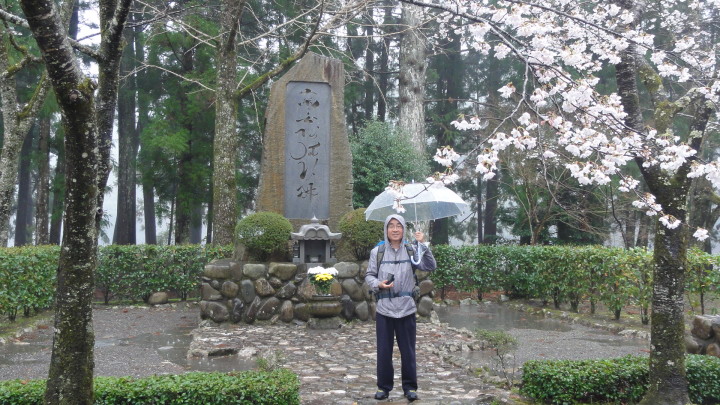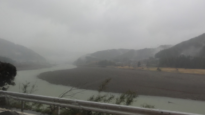I倉氏とT保氏は初対面のはずでしたが、二人とも集合前の早朝、神倉神社に参拝に行っており、その時にすれ違って言葉を交わしていました。従って合流した時はお互い周知の仲、改めて紹介する必要はありませんでした。発達した低気圧の影響で風雨が強くなってきました。熊野川に沿って国道168号を北上しますが、昨年9月の台風で熊野川が氾濫、道路を遥かに超える高さまで水がきたと運転手の話、いたる所に被害の爪跡が残っています。