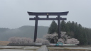 先ず、本宮大社旧社地である大斎原(おおゆのはら)へ。高さ34mの日本一の大鳥居と桜が迎えてくれます。境内に一遍上人の南無阿弥陀仏の名号碑がありました。