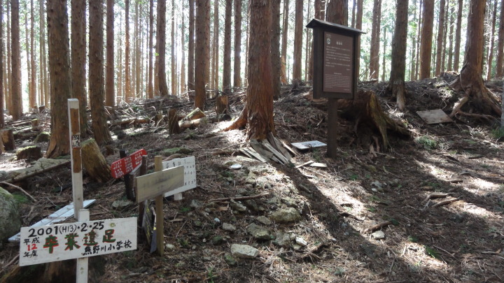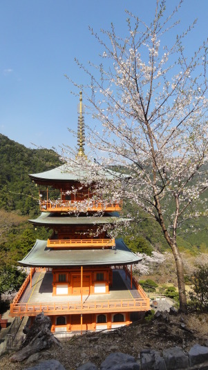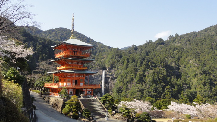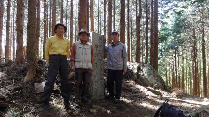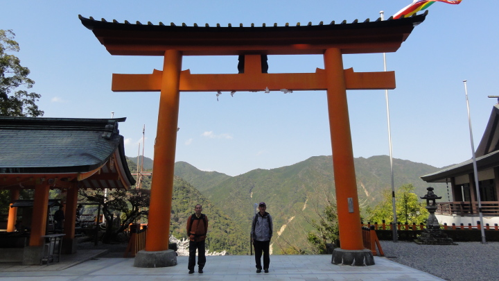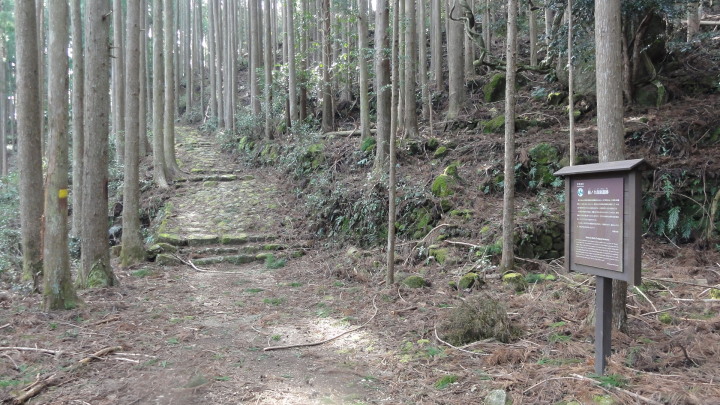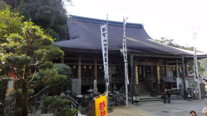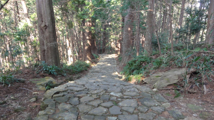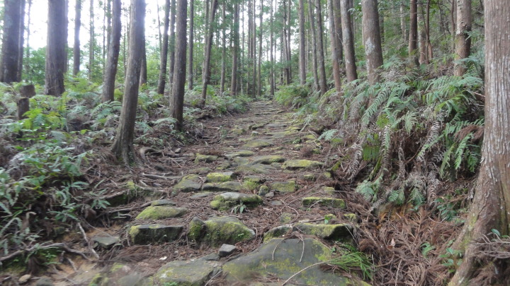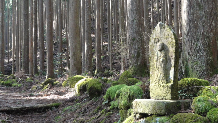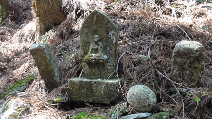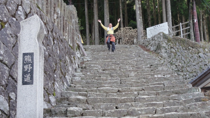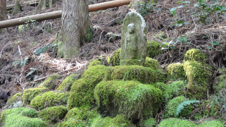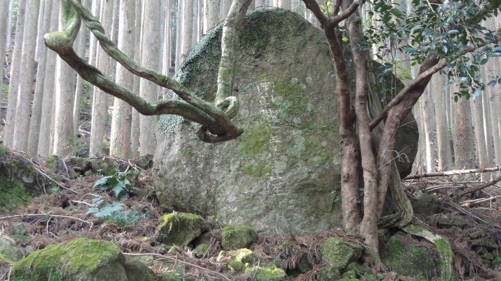 小口から大雲取越えで那智山まで歩き、青岸渡寺と熊野那智大社をお参りし、大門坂まで歩く16kmの旅です。 朝6時40分に出発、30分ほどすると円座石(わろうだいし)に着きます。熊野三山の神々がここで談笑したという御座所で、苔むした岩肌に熊野三山の本地仏が梵字で彫られています。(右:阿弥陀仏(本宮)、中:薬師仏(新宮)、左:観音仏(那智)). 8時過ぎに楠の久保旅籠跡を過ぎると大きな岩に南無観世音菩薩と彫ってありました。更に楠久保の地蔵が静かに佇んでいます。過酷な熊野詣の途中に志半ばで力尽きた人々の霊を供養した所で、他の場所にも地蔵菩薩がありました。最後の急坂の胴切坂を上って、9時45分に越前峠(840m)に到着。付近には卒業記念で大雲取越えをした小学校の記念板が立っています。 峠を越え急な下り坂を進んでいた10時半ごろ、那智方面から登ってくる人に遭遇。一人旅の老人でこれがビックリ。御年86才の千葉から来た方、滝尻から中辺路で本宮大社まで歩き、川下りで新宮に行き、更に歩いて那智大社を参拝して大雲取越え・小雲取越えで本宮大社に戻るという、平安時代の熊野詣の正規コース。トータル90kmを超すアップダウンの激しい道を連続して歩き通しているとんでもない老人です。「これが最後だから・・」と言って家を出てきたと笑っているが、顔の色艶、声が若々しい全く元気な人でした。 地蔵茶屋跡で昼食した後、また上りを暫く進んで13時過ぎに舟見峠(883m)に到着、遥か先には太平洋を望むことができました。 青岸渡寺三重塔と那智大滝の絶景を眺めてから、青岸渡寺(西国巡礼の一番札所)、熊野那智大社(主祭神は夫須美大神(イザナミノミコト))を参詣し、大門坂を下ったところで今日の旅は終了、バスで紀伊勝浦へ。 |