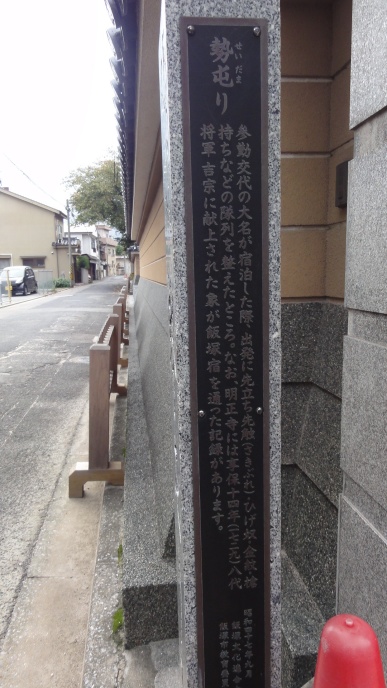 7時半にホテルを出発、昨日終点の中の原二丁目からスタートです。天気は曇りで所々に晴れ間も。小嶺台二丁目から旧道に入ると立場茶屋銀杏屋があります。黒崎宿と木屋瀬宿の間の「立場茶屋」として、参勤交代の諸大名をはじめ長崎奉行、巡見使などが休憩したところ。10時開館ですがまだ8時20分だったので外から見ただけで先を行きます。直ぐに石坂の急坂です、ここは黒崎宿と木屋瀬宿の間の難所で、現在は急な階段が続いていました。8時50分に茶屋の原(はる)の一里塚を通過(この辺りでは原を「はる」と言います。) 9時過ぎに木屋瀬宿に入りました。旧宿場町らしい雰囲気が漂う落ち着いた街並みです。永源寺には木屋瀬宿本陣の門が残っていました。9時30分に木屋瀬宿記念館(旧御茶屋跡)を見学、更に問屋場跡(野口家)、船庄屋跡(梅本家)、旧高崎家住宅(伊馬春部生家)、村庄屋跡(松尾家)など旧家を見ながら進みます。特に旧高崎家住宅は天保6年(1835年)の建築で江戸時代末期の代表的な宿場建築、ボランティアの方が丁寧に説明してくれました。この頃から雨が降ってきました。西構口跡の石垣、追分道標「従是右赤間道・左飯塚道」を見て木屋瀬をあとに遠賀川沿いの道に出ました。ところが車の往来が激しい歩道のない道で風雨の中、傘をさしながらの歩きで難渋しました。河原の道を探しますが草が高くてわかりません。仕方なくトラックが来ると立ち止まり立ち止まりしながら慎重に進みます。筑豊電鉄の陸橋を越えたところで漸く河原沿いの道に入りやっと一安心、日の出大橋で遠賀川を渡り、直方に入りました。 直方の古町商店街を抜け、直方西構え口跡、直方谷尾美術館(旧奥野医院 近代化産業遺産)、旧篠原邸(大正4年建築)などを見ながら先を進みます。そろそろ食事時、次の勝野駅近くに何かあるだろうと思っていくと、駅は畑の中にぽつんとあるだけで周りは何もありません。仕方ないので先を急ぎ、国道に合流して13時過ぎにやっと見つけたコンビニで弁当を買い食べました。14時45分に旧伊藤伝右衛門邸に到着、見学しました。伊藤伝右衛門は筑豊の炭鉱王で本邸は旧長崎街道に面し、四つの居住棟と三つの土蔵を持ち、広大な回遊式庭園を持つ屋敷です。土蔵の一つでは、世界記憶遺産に登録された山本作兵衛のヤマの絵画13点の原画が展示されていて中々見応えがありました。 更に進んで、16時にケンペルやシーボルトが泊まったオランダ屋敷跡を通過、飯塚の氏神である納祖八幡宮を過ぎるとアーケード街に入ってきます。アーケードには長崎街道宿場祭の幟が立っていました。16時20分に明正寺に到着、寺の脇には勢屯り(せいだまり)の石柱があり、そこに明正寺には享保14年(1729)に八代将軍吉宗に献上された象が飯塚宿を通った記録があると書かれています。 夜は居酒屋「趣肴や」で一杯。若い主人は飯塚山笠のメンバーらしく店内に写真が飾ってありました。(飯塚山笠:享保年間に始まったと言われ、復活40年以上の歴史がある) |