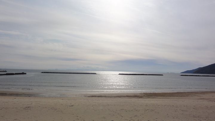 13時に西ノ浜の海水浴場でコンビニお握りの昼食。