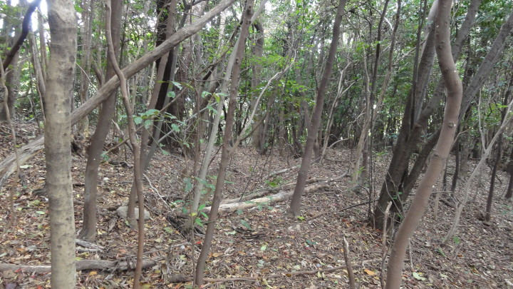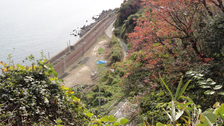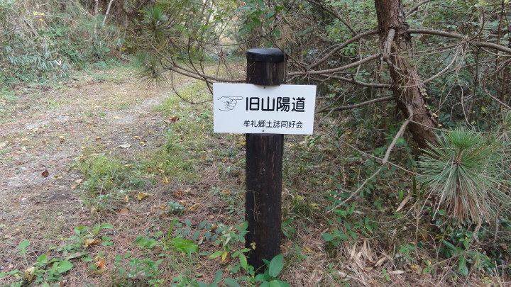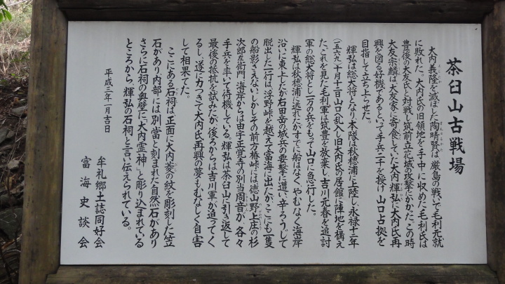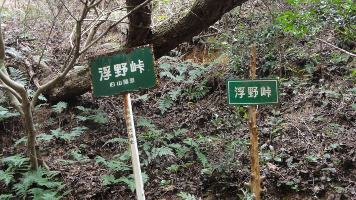 その後、橘坂を登って浮野峠を目指します。橘坂の中腹に手懸岩があります。山陽道の旅人達はこのあたりに来ると眼下に見える瀬戸内海の絶景にしばし足を止め、この前にある岩に手を懸けて休んだと言い伝えられています。又、尾張の菱屋平七は「筑紫紀行」にこの辺りは東海道の薩埵峠によく似ていると書き残しています。確かに急な崖の下にJR山陽本線と国道2号線、山陽自動車道が走り、その先は海という地形は薩埵峠に良く似ています。更に登っていくと「茶臼山古戦場」があります。毛利氏と大友氏の戦いの間隙を縫って、大内家の再興を願った大内輝弘は大友氏の支援を受けて、永禄12年(1569)に山口占拠を目指して挙兵したが、戦いに敗れこの地でむなしく自害したと説明されています。更に進むと、旧山陽道と書かれた標識があるので細い道を入っていきます。次第に道が悪くなり、細い木が生えていて前に進めません。仕方なく元の道に引き返すとこれが正解。紛らわしい標識は困ったものです。浮野峠を越えてやっとの思いで浮野町に出ました。