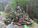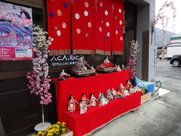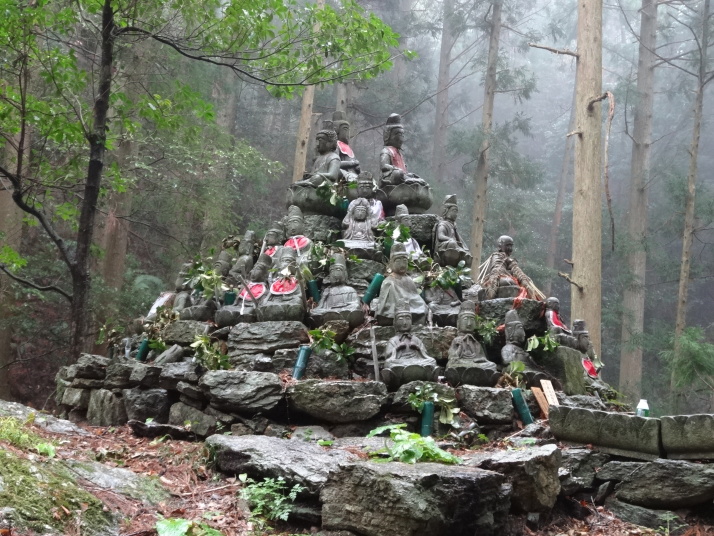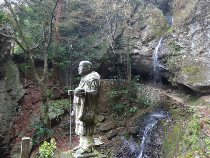 今日は一日中雨の中を歩きました。朝一番で19番立江寺を参拝した後、小高い山にある番外の取星寺に立ち寄り、更に進んで勝浦町に入っていくと、各家庭や店先に立派な雛人形が外から見られるように飾ってあります。メイン会場の「ビックなひな祭り」展に行きました。雨で濡れた格好で行くと、事務所に案内され合羽やなにやらをストーブで乾かしてくれ、お茶のお接待も受けました。一息入れてひな祭り展を見学、3万体を越える人形が所狭しと飾ってあり壮観でした。 道の駅でお接待の握り飯を食べて、番外星の岩屋へ。250mまで登ると、大きな岩から滝が落ち、ちょっと小太りな大師像があります。弘法大師が天空に現れた悪星を失墜させ、岩屋に封じ込めると石と化したので、この石を祀ったとの伝説があります。この滝は裏からも見られる裏見の滝になっていました。 |