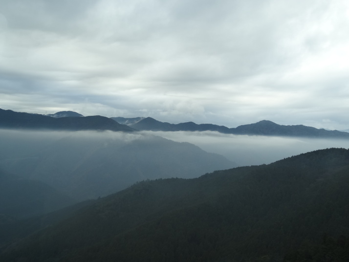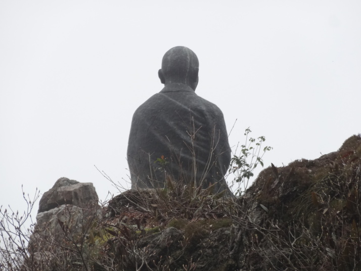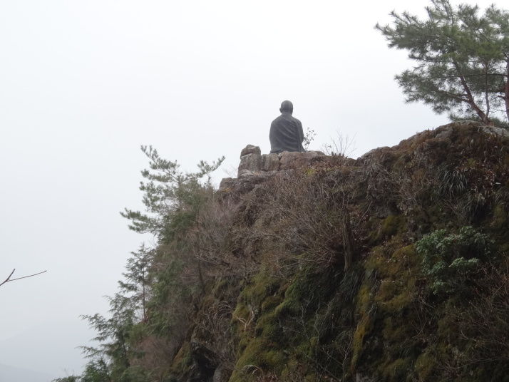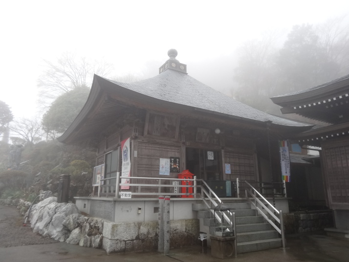 今日も朝から小雨模様。先ずは別格3番の慈眼寺へ、標高550mのお寺は霧に霞んでいました。途中へんろ小屋で休憩、雨が降っている時は屋根があるところでの休憩は有難いです。 雨で滑り易い坂道を下って1時間程で旧大井小学校跡へ。ここでお茶・菓子のお接待がありました。徳島大学の学生主催で歩き遍路をしているグループのお接待をする会とのこと。標高40mまで下って今度は登り、最初は緩やかな上りが続きましたが、その分、最後は階段状の坂道で標高を稼ぐ道になっていてこれが意外ときつい。15時15分にやっと太龍寺520mに着きました。参拝後、弘法大師が19歳の時、虚空蔵求聞持法を修法されたという番外の舎心嶽530mへ、修行する大師がいました。ここから麓へ下ろうと思っていましたが、危険注意の看板があり、安全第一でロープウエイを使って降り、今日の宿へ。 |