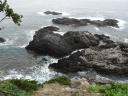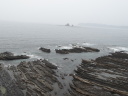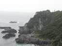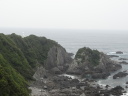 13時半ごろ叶埼灯台に着き、灯台の先の遊歩道を進み岬の先端へ。断崖絶壁の場所から雄大な太平洋を眺めました。この頃からポツポツと降り始め次第に雨は本降りに。そんな中15時ちょっと前に月山神社へ行く遍路道に入りました。この遍路道には地元の月山小学校の児童が作った激励の札が沢山掛けられています。これには本当に勇気付けられました。15時半に番外月山神社を参拝しました。 |