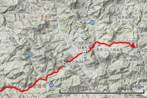 | 宿7:15→鴇田峠12:20→44番大宝寺13:45→古岩屋16:00→宿16:10 |
