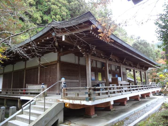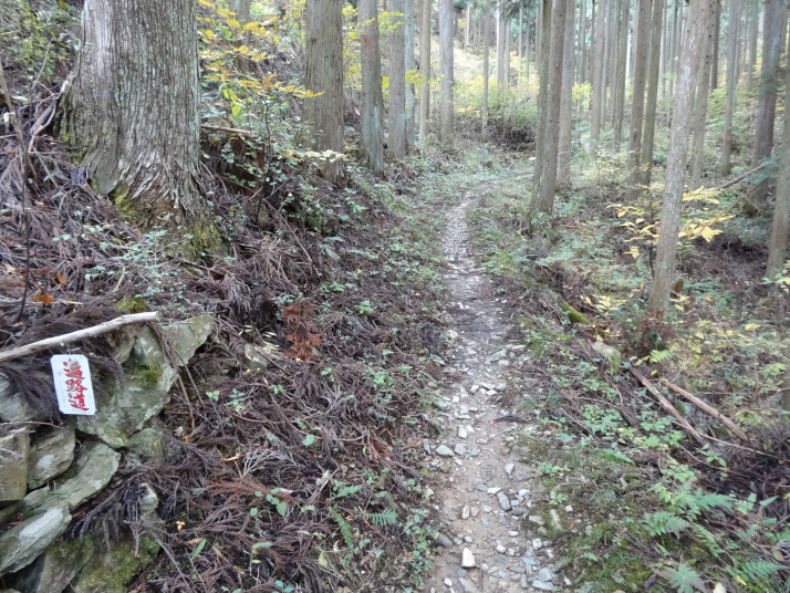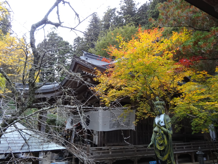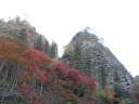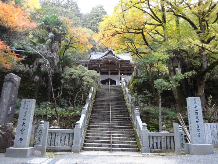 鴇田(ひわだ)峠790mを越えて久万高原にある大宝寺を目指した一日。 先ず、吉野川沿いに進んで行くと正月用の門松を作っている農家が多く見られます。三嶋神社で休憩して更に進むと、ある農家に霊場納経塔が立っていました。坂東・秩父・西国・四国の各霊場を巡拝し大正2年8月に満願したという女性の碑、大したものです。12時20分に鴇田峠に到着、かつては主街道として賑わった所で昭和30年頃まではこの場所に茶屋があり行き交う人々が一休みしたとあります。 ここから標高約500mの久万高原まで下りていきます。久万高原町は現在ラグビーで町興し中、毎年3月に高校ラグビーの大会もあるらしい。昼食後、44番大宝寺を参拝。仁王門の金剛力士像は享徳4(1455)年に彫られたもの、又、大草鞋も迫力があります。本堂、大師堂が紅葉に彩られていました。その後、遍路道を進むと予想もしていなかった急な上り、ピーク715m地点まで行って下ります。16時に古岩屋に到着、巨大な円錐状の礫岩峰が紅葉の中に聳えています。水の浸食作用によって岩が剥き出しとなり、無数の穴が空いた特異な景観で国の名勝に指定されています。 |