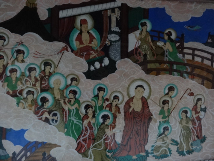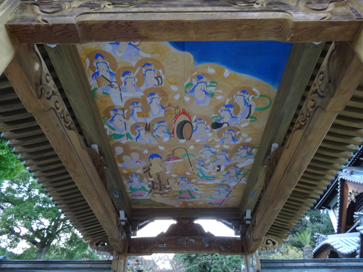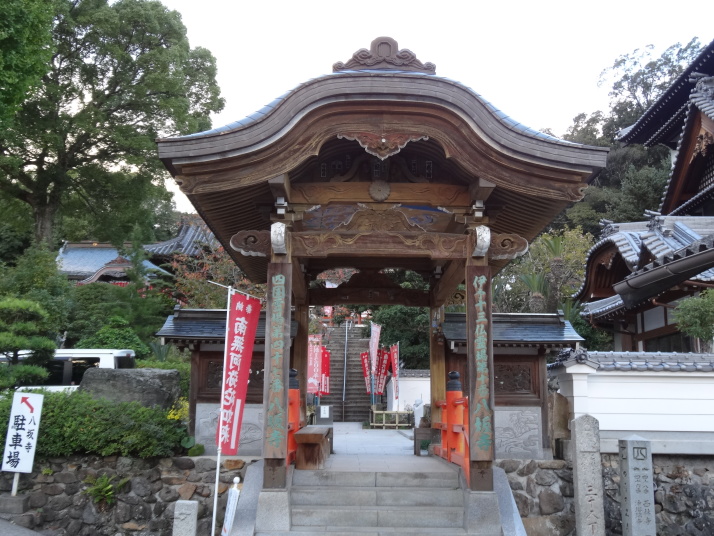 昨日の浄瑠璃寺から始まるここ一帯は遍路の元祖とされる衛門三郎ゆかりの里です。7時過ぎに47番八坂寺を参拝、山門と橋が一体となっていて、天井には極楽浄土の画が描かれています。本堂の地下には万体阿弥陀仏が所狭しと安置され、閻魔堂の両端には「極楽の途」「地獄の途」があって、それぞれ内壁に極楽浄土、地獄の絵図が描かれています。