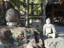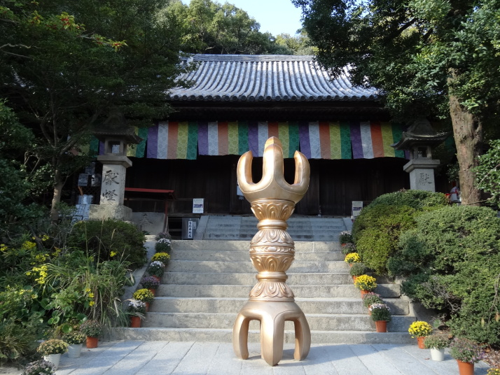 番外の杖の渕、香積寺を経て昼食後に48番西林寺へ、伊予の関所寺と呼ばれています。更に3㎞ほど進むと49番浄土寺に至ります。空也上人ゆかりの寺で本堂は室町時代の文明14(1482)年に再建したもの、堂内の内陣にある一間厨子や空也上人立像と共に国の重要文化財となっています。50番繁多寺は松山生まれの遊行上人の一遍が学問を修めた寺。14時20分に51番石手寺に到着しました。衛門三郎ゆかりの寺で、参道入口には衛門三郎の像があり、参道脇に土産物店が立ち並んだ先に仁王門(国宝)があります。本堂・三重塔・五輪塔・護摩堂・鐘楼・銅鐘など重文となっている文化財が豊富で見応えのあるお寺でした。