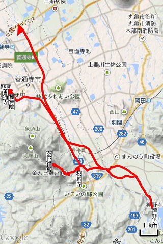 宿7:40→75番善通寺7:45→観智院8:15→松尾寺11:00→金比羅宮12:00→別格17番神野寺14:20→宿18:00 |