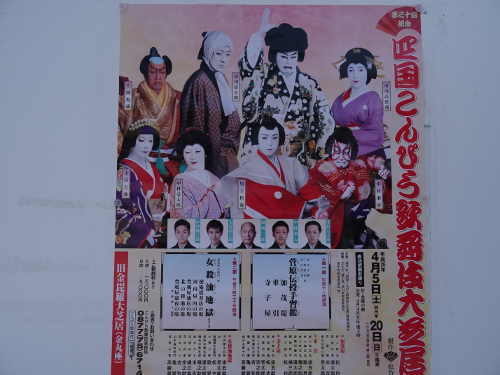 朝6時から御影堂で勤行があり、その後は地下にある真っ暗な通路の「戒壇巡り」へ。左手で壁を伝いながら真っ暗な道を進んでいると一種異様な雰囲気に包まれます。60~70m進むとうっすら灯りのある所に着き、「こんにちは・・・」とお大師様の声がします、これは日本音響研究所が再現したお大師様の声だそうです。低い優しい声でした。善通寺は弘法大師誕生の寺で父の名、佐伯善通から命名。東寺、高野山とともに空海三大霊場の一つに数えられる、重厚な本堂(金堂)、美しい五重塔がある立派なお寺でした。 隣接する番外観智院を参った後は7kmほど進んで琴平町へ。こんぴらさんと縁の深い番外松尾寺を経て近くの金毘羅大芝居(金丸座)に行きました。4月5日から染五郎の公演があるため今日から定休日、でも係の人に断って中を写させてもらいました。いよいよ「こんぴらさん」、参道は桜が咲き始めていました。途中の茶店に荷物を預けて石段を上ります。500段目にあったレストランで小休止した後、785段の金刀比羅宮本宮へ。更に583段上って奥社の嚴魂神社へ計1,368段、良く上りました。下に降りて昼食の後は満濃池へ。日本最古の農業用溜池で弘法大師が修復の大工事を指揮したといわれます。近くに別格17番神野寺があります。後はひたすら歩を進めて76番金倉寺を目指しましたが、納経時間の17時が過ぎるのが判ったので明日にして宿へ、18時にやっとビジネスホテルに投宿しました。今日は33.5㎞歩きましたが、直線距離では3.6㎞とあまり効率的でない一日でした。 夜は外食、国道沿いのホテルで近くに飲み屋がないので事前に調査済の店を探しましたが見つかりません。仕方なく偶々あった別の店に。でもこの店「ひな鶴」も結構良い店でした。かなりいい気持ちになって帰りがけにもう一度注意しながら進んでいくと、やっと本来の店「いち」が見つかりました。道路から奥まった所にあり、案内も出していない地元優先の店。ちょっと顔を出し隣の席のオッサンと小一時間馬鹿っ話をして退散しました。 |