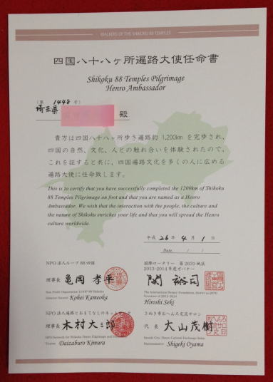 本日で結願しました。 遍路道沿いにある「前山おへんろ交流サロン」に立ち寄ると、「四国八十八ヶ所遍路大使任命書」・「四国八十八ケ寺のDVD」・「四国遍路開創1200年記念バッチ」をもらいました。これは、歩き遍路に渡されるもので、任命書はNo.1448となっています。昨年7月1日からの累計の番号、従って年間の歩き遍路の数は2000人前後と思われます。 「女体山山頂まで1,138m」の石柱を過ぎるあたりから険しい上りになり、金剛杖が邪魔になるほどの急峻な岩山をよじ登って763mの女体山山頂へ。讃岐平野や瀬戸内海の眺望が楽しめました。時間は既に16時を廻っています、大窪寺の納経時間が気になってきました。急いで下って番外胎蔵峰を経て、更に急な遍路道を走り下って、やっと大窪寺に到着。どうにか納経締切2分前の16時58分に納経所に入り結願の納経をしてもらいました。その後、本堂、大師堂をお参りして今日の宿へ投宿しました。 結願時の感想は意外と淡々としたもの。「徳さんのお遍路さん」では徳光氏が感激して涙を流していましたが、結願直前まで間に合うかどうか気を悶んでいたことや、明日も別格20番大瀧寺910mを上ることもあり、一つの区切りとしてホッとしたというのが偽らざる気持でした。 |