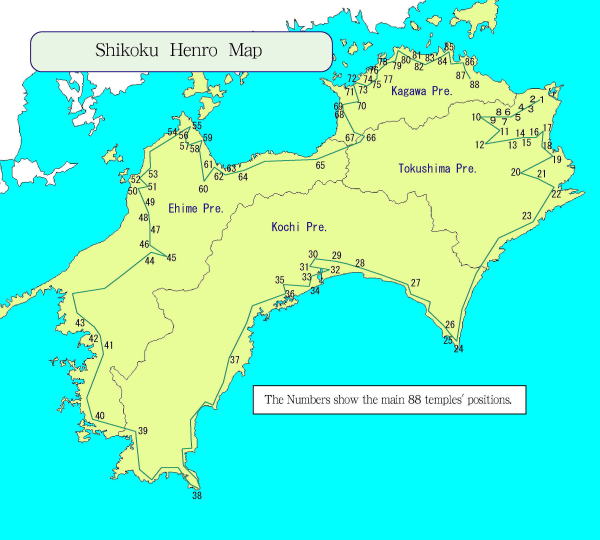 1.四国遍路とは弘法大師・空海(*1)が修行をした寺や場所を巡りながら四国を一周する巡礼の旅です。特に主要な88の寺に番号を付け、これを「札所」と呼んでいます。この他に番号が付かない番外霊場が148ヶ所あり、この内の主要な20ヶ所を「別格番外霊場」と呼びます。88ヶ所の札所を全部歩くと1,200q、これに別格番外霊場20ヶ所を加えると1,400q、全ての霊場を回ると1,600〜1,700qの距離になります。