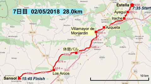 Estella 7:35〜Irache 8:25〜Villamayor 10:40〜休憩バル 12:00〜Los Arcos 13:40〜Sansol手前 15:45 |