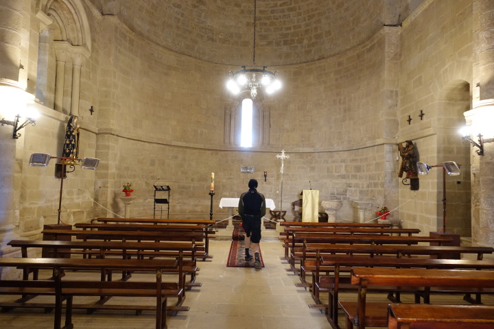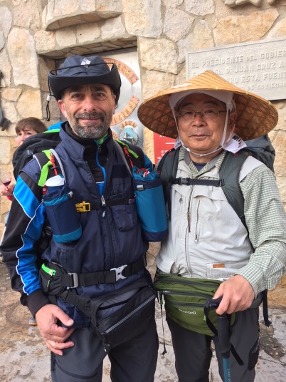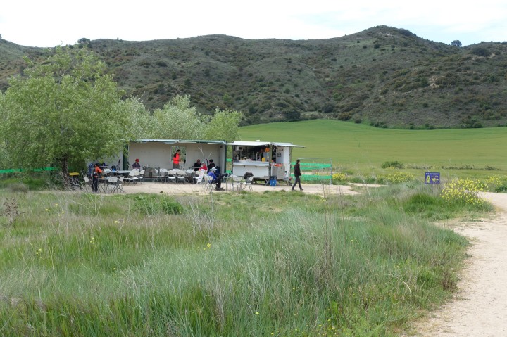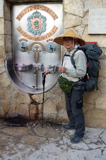 巡礼も7日目に入り、かなり身体も慣れてきたようです。今日も天気が良く気持ち良いウォーキング、山崎さんと一緒です。まず、Fuente de Vino(イラーチェの泉)でワインを一杯。イラーチェ酒造が無料でワインを提供してくれているもの。これで元気100倍、その後は葡萄畑と麦畑、菜の花畑が広がる美しい景色を見ながら、ひたすら距離を稼ぐ一日でした。行程の半分はトンガリ山を右手に見ながらの歩き、頂上にはサン・エステバン城。 行程の中ほどに青空バルがありました。丁度休憩したいと思う絶妙のタイミングのところ、流石です。 ロス・アルコスはローマ時代から続く町でいかにも古い感じ、巨大なサンタマリア教会の前のバル街で昼食をとり、16時前に今日の宿へ。サンソル手前の最近出来たアルベルゲでした。 |