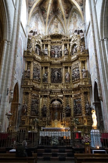 ログローニョはリオハの州都、流石に大きい町。大聖堂は15世紀に建立、18世紀に改築され、双塔も内部の祭壇バロック様式。聖バルトロメオ教会は13世紀の初期ゴシック様式で、タンパンにはたくさんの彫刻があります。サンティアゴ・エル・レアル教会の入口正面上部には白馬にまたがった聖ヤコブ像の彫刻があります。844年に起こったクラビホの戦いで白馬に跨り剣を振りかざすサンティアゴが現れキリスト教徒を鼓舞したという伝説によるもの。この先、この構図の彫刻や絵画を多く見ることになります。