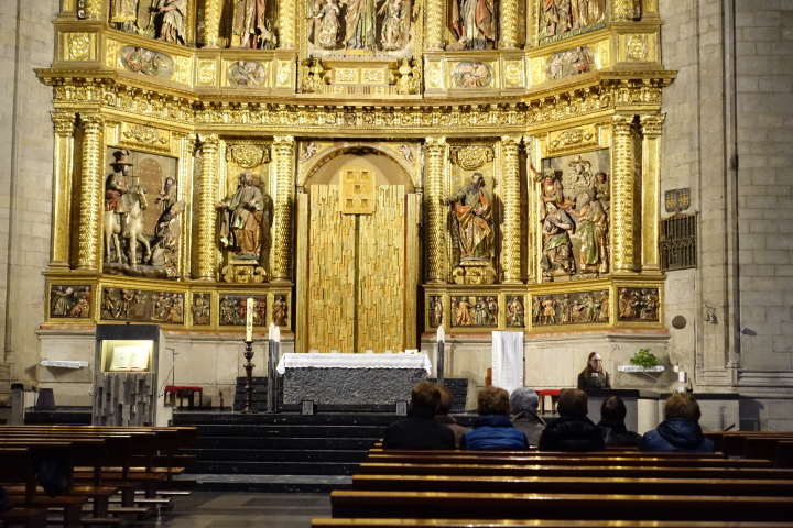 今日は曇りがちで冷たい風が吹く中の歩きでした。トレス・デル・リオは典型的なスペインの村、集落の中央に美しい教会と水飲み場があります。聖墳墓教会は八角形のロマネスク様式で12世紀に建造。ここを過ぎると次の村はビアナまで10q以上ありますが、途中の林の中に青空休憩所が、この青年は四国八十八か所を知っていました。 ビアナのサンタ・マリア教会は13世紀建造のゴシック様式で規模も大きく、中も絢爛豪華です。 そんな中、途中から一緒になった山崎さんが突如「ゴミ取り爺い」に変身、ゴミを拾いながら歩き始めました。重い荷物は次の宿泊場所までトランスポート(5ユーロ)したので、軽くなった分、何かしようとゴミ拾いを始めました。残念ながら、カミーノ沿いにも結構ゴミが落ちています。日本のオモテナシの心を広めてくれました。