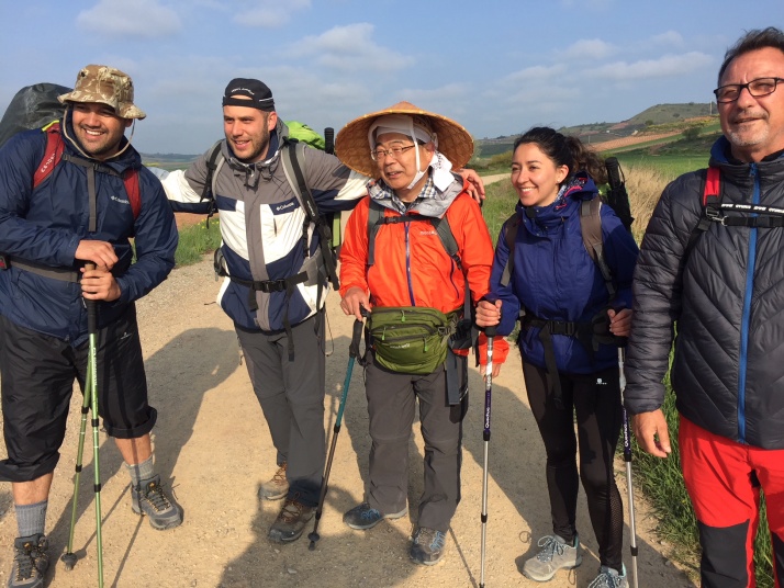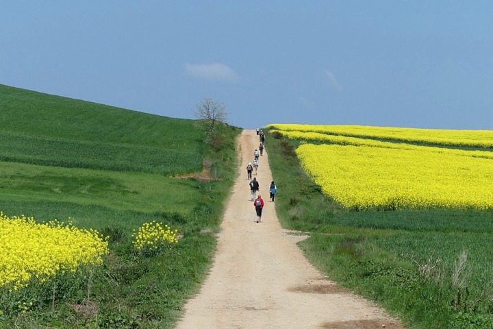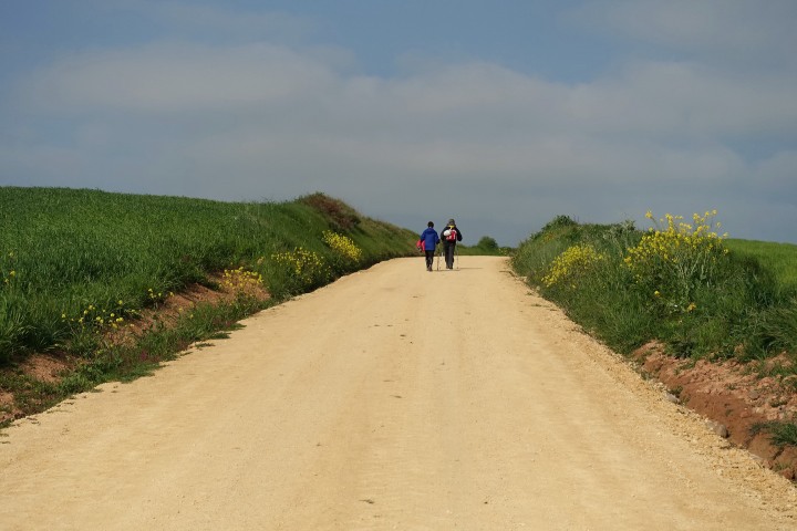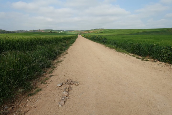 最初は赤土のぶどう畑の中を歩き、Azofraを過ぎる辺りから緑の麦畑、時おり菜の花畑の黄色が織りなす一本道を歩きます。こんな道が有るのだろうか?これがカミーノ!とその美しさに感激しながら歩きました。