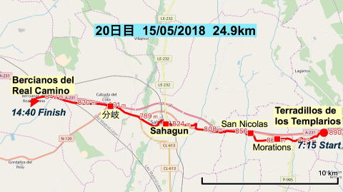 Terradillos 7:15〜Moratinos 8:15〜San Nicolas 8:55〜Sahagun 11:10〜分岐 13:00〜Bercianos del Real Camino 14:40 |
