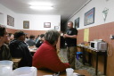 Valderaduey)を渡るとバレンシア県からレオン県に入ります。川のほとりに12世紀に建てられた橋の聖母教会(Ermita de la Virgen del Puente)があり、その前にはサアグーンの町の入口を示す門が聳えていました。 サアグーンはレンガ造りの教会が並ぶクリュニー修道会の町で、レンガの家が並んでいます。日本でいうと深谷市のようなところ。特にサン・ロレンソ教会やサン・ティルソ教会が代表的ですが、どうもサン・ティルソ教会の写真は撮り忘れたようです。町の出口には、一時、スペインで強力な力を持ったサン・ファクンド修道院(現在は旧跡)付属の門であるサン・ベニート門がありました。サアグーンはカミーノの中間地点でもあります。 その後も国道沿いの真っ直ぐな道を進み、途中羊飼いに会ったり、休憩所の掃除をしながらBercianos del Real Camino に到着です。 今日のアルベルゲは公営で料金は寄付制。夕食は宿泊者50人が一堂に会して、陽気なホスピタレーロが昔のユースホステルのへルパーの様に場を盛り上げ、笑いを誘いながらの楽しい食事。最後は、Mr.Gomitoryがポイ捨て禁止の啓蒙をしてお開きになりました。 このホスピタレーロは数日後カミーノに出発して、この先何回か顔を合わすことになります。 |