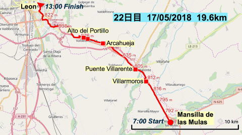 Mansilla de las Mulas 7:00〜Villamoros 8:05〜Puente Villarente9:05〜Arcahueja 10:00〜Alto del Portillo 10:35〜Puente Castro 11:30〜Leon 13:00 |