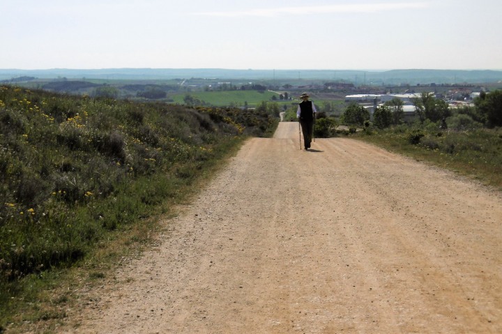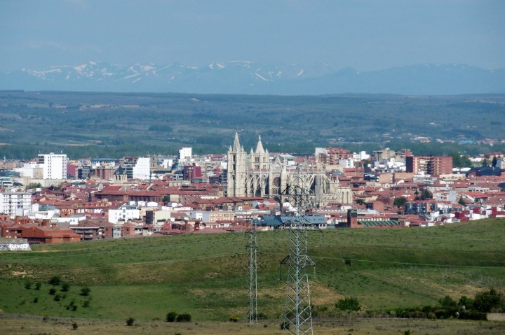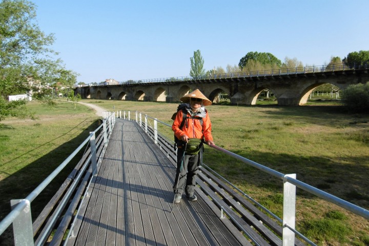 今日はレオンまで20km弱の緩めのコース。幹線道路に近い小道を歩くと車の多さにびっくり。これまで日に10台位しか見なかったのが、今日は1分間に10台は来ます。やはり大都市レオンに近づいた為か。天候も日中は快晴で久し振りに暑さを感じました。 最初の村Villamoros ビジャモロス で開店早々のバルに入り朝食。ここの教会の鐘楼にコウノトリの巣があります。暫く進んでポルマ川を渡るとPuente de Villarente ビジャレンテ橋に着きます。ローマ時代の橋で何回か修復を繰り返し、直近の修復は1833年。20世紀に拡張されて20のアーチ、約200mの巨大な橋です。近づくと歴史の重みを感じます。 ここから少しづつ緩やかな上り坂になり、Arcahueja アルカウエハ、Valdelafuente バルデラフエンテの村を通って、10時35分にAlto del