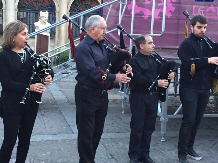 昼食はレオン郊外にある中華バイキング。寿司に似た料理や味がわかる料理が並んでいるので安心です。海鮮の具材を選んで持っていくと焼いてくれます、満腹の昼食でした。その後はやる事もなく、宿に戻ってシエスタです。部屋に戻ると女性が2人います。あれ、ひょっとすると? その後、男性が1人来てあっさり期待は裏切られました。 夜は昨日見つけた日本料理の店で。地酒や焼酎など日本の酒が並んでいます。久し振りに天狗舞を飲みました。スタッフに天狗舞の酒蔵の写真を見せると喜ばれました。スタッフは現地の人ですが出てくる料理は意外ときれい、味もいいです。締めに抹茶を点ててもらいました。 外に出ると、今夜は祭りのよう、バグパイプの演奏が近くでありました。こんな所にもケルト文化の影響が分かります。 |
