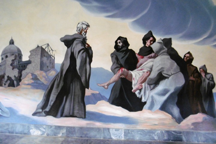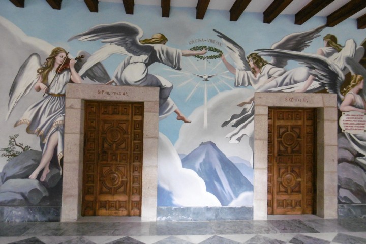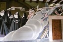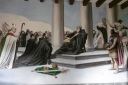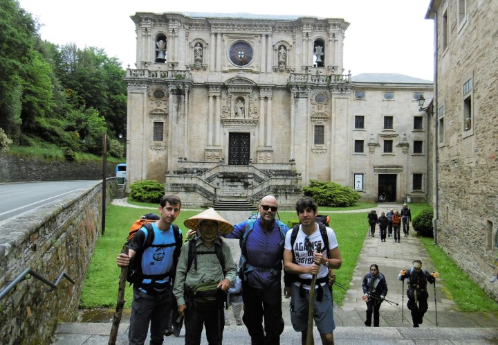 夜明け迄雨が降って朝は濃い霧、今にも降りそうな様子だったので完全雨装備で出発。最初は標高1,200mから670mまで一気に下り、その後は小刻みにアップダウンをくり返す道。天気は降りそうで降らず、最後は青空も見せていました。 今日訪れたサモス修道院はスペイン最古、西欧でも最古を競うベネディクト派修道院で5-6世紀建造といい、その後何回か再建を繰り返しています。1951年の火災で焼失した壁画を再生して鮮やかに蘇っていました。約1時間スペイン語と英語による説明を聞きながら見学しました。ここで、セビージャから来たフラメンコのシンガーという3人組に会い冗談を言いながらこの先も一緒に歩きました。これからも何回か会うことになります。 宿泊はサリアの手前3kmのSan Mamedにあるアルベルゲ。人懐っこい大きな犬がいたりして、なんかのんびりしました。夕食は宿泊者全員でテーブルを囲んで食べますが、東洋人は一人。 明日からいよいよ100km歩くと巡礼証明者をもらえるというサリアに入ります。巡礼者も増える事でしょう。 |