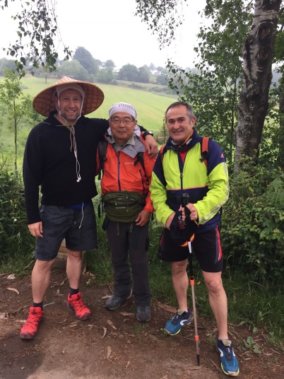今日は距離も短いのでゆっくりスタート。曇り空で歩き易いけど、ガリシアに入ってずっとこんな肌寒い天気、なかなか青空を見せてくれません。歩いて直ぐに団体の一群に遭遇、荷物はトランスポートして軽装な人が多いようです。立派な杖を作って売っているおじさんがいましたが、こんな立派なものを買う人がいるのだろうか。殆どの人は今風のトレッキングポールを持っています。 途中、思いがけず産まれたばかりの子牛を見ました。人だかりがするので行ってみると、野原で自然分娩した子牛を立たせようと母牛が一生懸命指導している様子がいじらしい。 重い荷物を背負った女性に追い抜かれました。腰の入った惚れ惚れするような歩き方、特に山道に入るとどんどんスピードを増し追い抜いて行く。そのため写真もピンボケです。 Mr.Gomitory2号も発見しました。夫婦の巡礼者で荷物は軽め。主人がゴミ袋を持ち、ゴミを拾いながら歩いています。カミーノ・クリーン運動もじわじわ浸透しているようです。 マドリードから来た二人組と会い記念写真、この後バルで再会、ビールをご馳走になりました。 早目に着いたので昼は巡礼定食にしました。これまで昼食はセルベッサ・グランデ中心に誤魔化してきたので久し振りにガッツリと。ボリュームがあり過ぎて満腹に、帰りにスーパーで食材とビールを仕入れて夕食は簡単にする事にしました。 |
