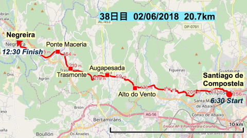 Santiago 6:30〜Alto do Vento 9:00〜Augapesada 9:50〜Trasmonte 11:00〜Ponte Maceria 11:40〜Negreira 12:30 |