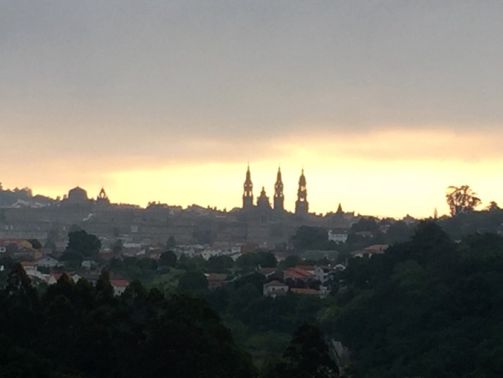 フィニステレへ90kmの第1日目はネグレイラまで。今日の距離は短くてガイドでは22.4kmでしたが、実績は20.7kmで12時30分には到着しました。 6時半にアルベルゲを出発。先ずは大聖堂へ、早朝のオブラドイロ広場は静かです。僅かに女性二人が到着の感激に浸っていました。この女性たち、途中で私の菅笠姿の写真を撮ったと見せてくれました。思わぬ出会いです。お互いに写真を撮って別れました。 サンティアゴ迄の様子と違い、歩く巡礼者は疎らです。ここを歩く人は巡礼者の5%程と言います。殆どはサンティアゴで終了とし、仮にフィニステレに行くとしてもバス利用が大半で歩く人は少ない。又、トランスポートを利用する人も無く、皆重い荷物を背負って歩いています。